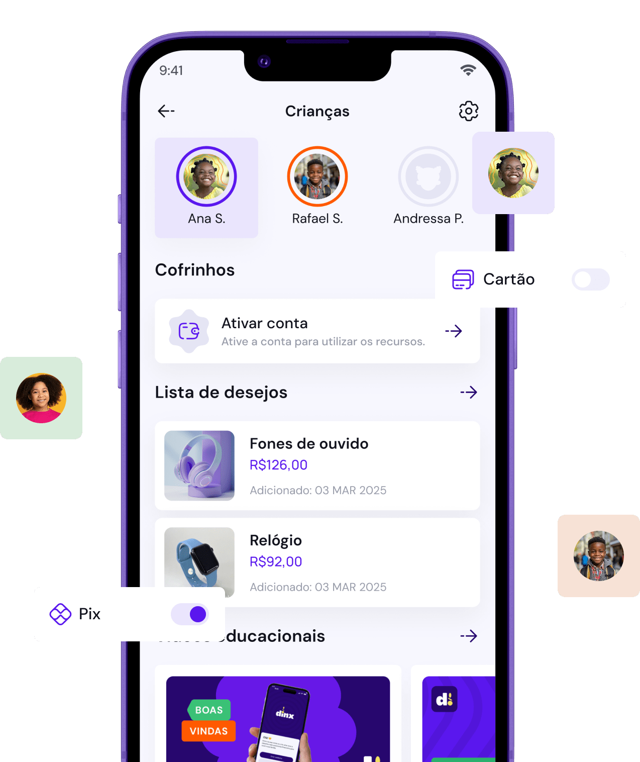 A experiência Dinx também foi pensada para os pais, com controle total ao app da criança e conteúdos exclusivos que transformam o jeito de viver a educação financeira em casa.